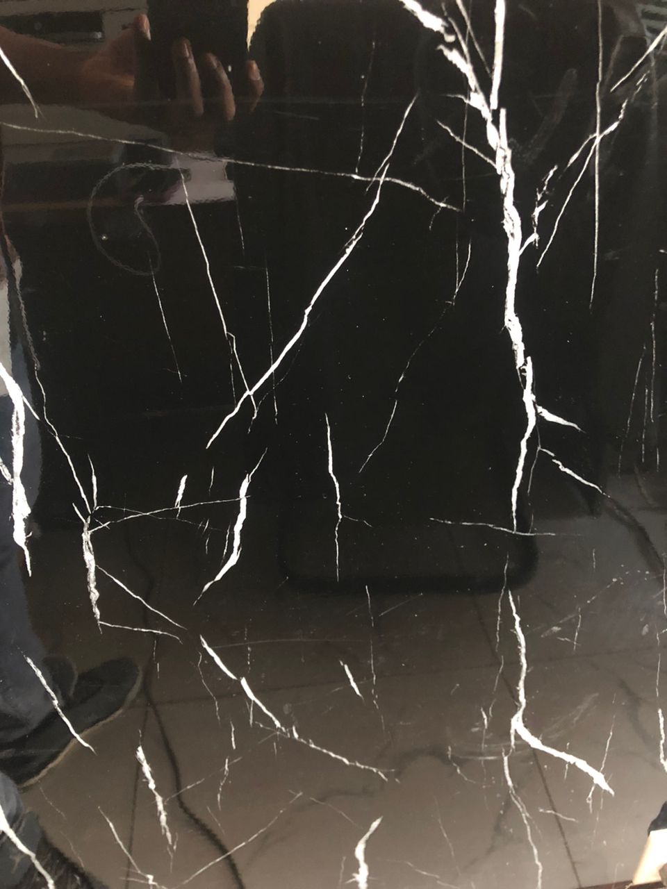 This board is predominantly black with stark white veins cutting across it. The high contrast between the black background and the white veins gives it a dramatic and elegant appearance.
